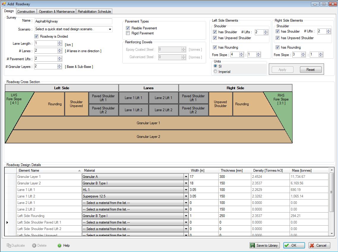 The application then opens the "Add Roadway" dialog. In this dialog, enter the design name, i.e., "Asphalt Highway" and fill in the number of lanes, lane length, number of pavement and granular lifts, chose if the roadway is divided and flexible (asphalt) or rigid (concrete) pavement. Then you can choose if there is a right or left shoulder, the number of pavement lifts of paved shoulders, and if there is an unpaved shoulder. You can also add rounding to the design and specify the ditching fore slope.