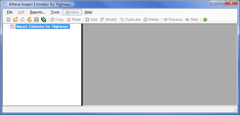 When you first open the Pavement LCA application, a typical MS Application Program menu bar appears immediately under the Athena - Pavement LCA Tree Control Window title bar (File, Edit, Reports, Tools, Window, Help) along with a set of familiar icons under the menu bar. This first level tool bar is used to initiate project assessments by either creating a new project input file or opening an existing (previously saved) project input file. As with most application programs, you can use the File menu to either create a New project input file or Open a previously saved project input file. You can also click on the first icon (reading left-to-right) to create a new project input file or click on the second icon to open a previously saved project input file. By default, all saved project input files reside in the main Pavement LCA folder unless you select another directory/folder pathway when executing a Save As file operation.