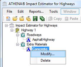 When the node for "Extra Basic Materials" has been selected within the Pavement LCA Tree Control Window, the following options will be available in the edit sub-menu: